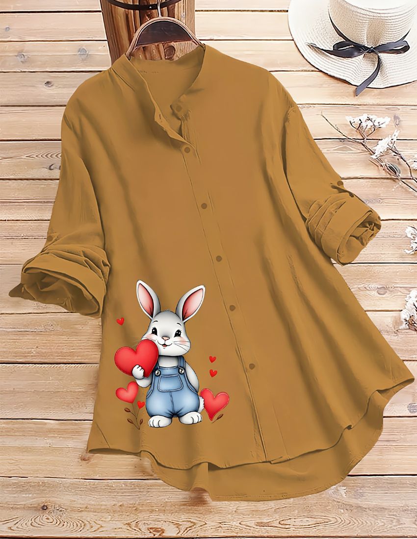 This stylish and comfortable button-up shirt. adding a playful and charming touch. With a relaxed fit, rolled-up sleeves, and a mandarin collar, this shirt is perfect for casual outings or lounging in style. making it a great choice for any season. Pair it with jeans or leggings for a cute and cozy look!