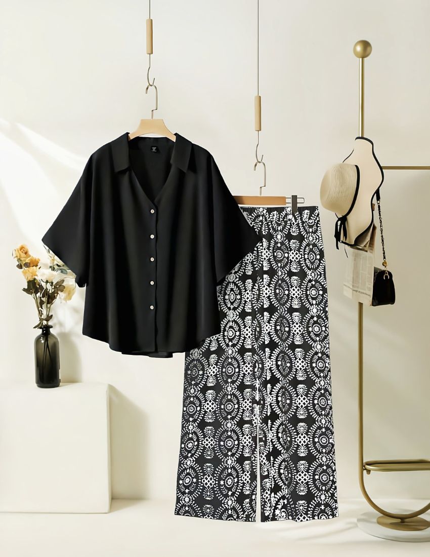 This stylish outfit features a flowing Black-colored button-down top with a relaxed fit and wide sleeves paired with matching palazzo pants adorned with an abstract geometric pattern. Perfect for casual outings or a chic relaxed look. Made in a beautiful color our signature smock-inspired top always stands out.