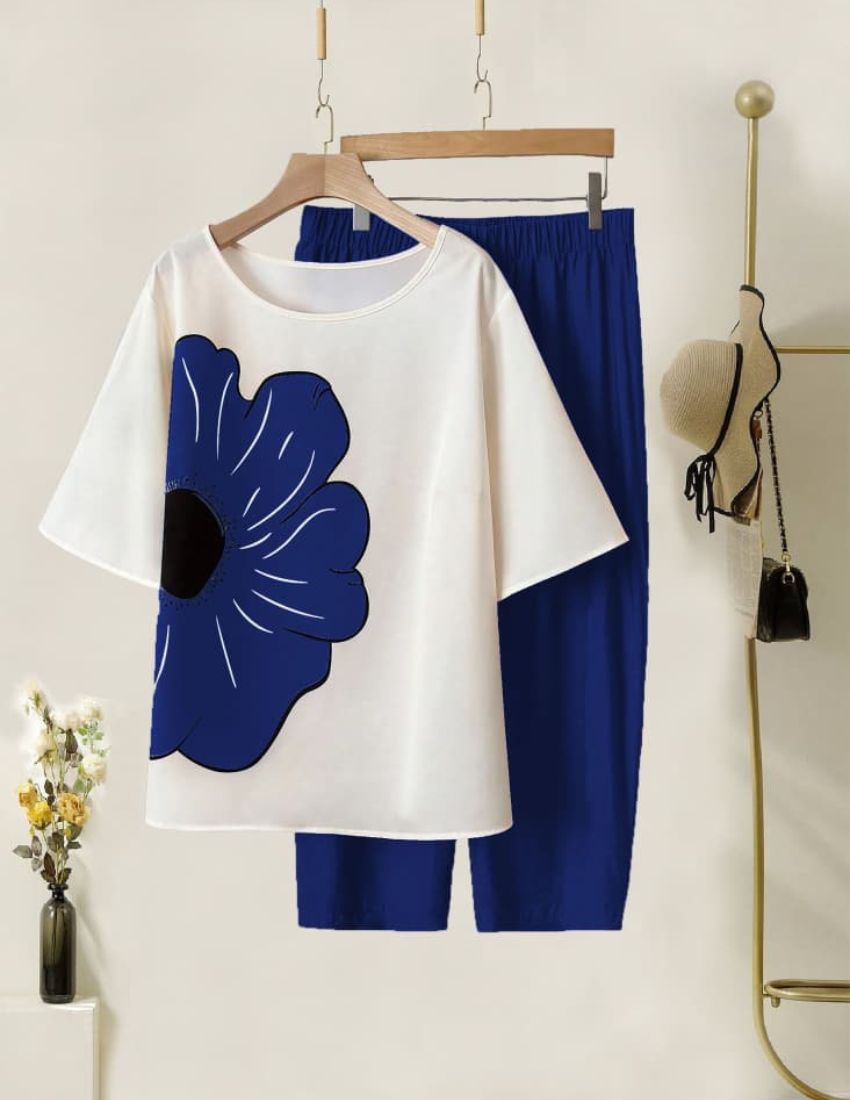 Step into effortless elegance with this chic two-piece lounge set. The oversized white top features a bold royal blue floral graphic, paired with matching royal blue bottoms for a perfectly coordinated look. Crafted from lightweight and breathable fabric, this set blends comfort with modern style—ideal for casual wear, lounging, or travel.