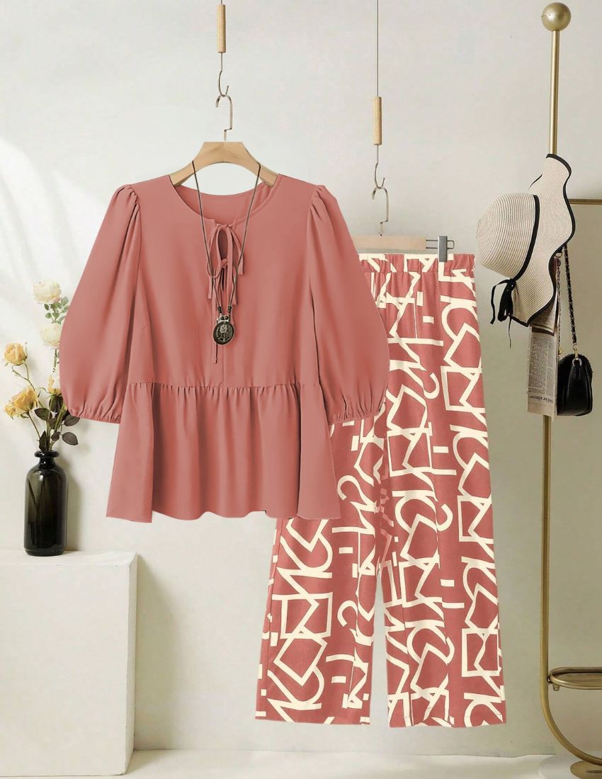 Turn heads with this elegant blush-toned top bottom set that blends minimal charm with abstract expression. The soft peplum top features gathered sleeves and a front tie-up neckline, adding a touch of femininity and comfort. this outfit offers effortless style for both casual outings and relaxed occasions.