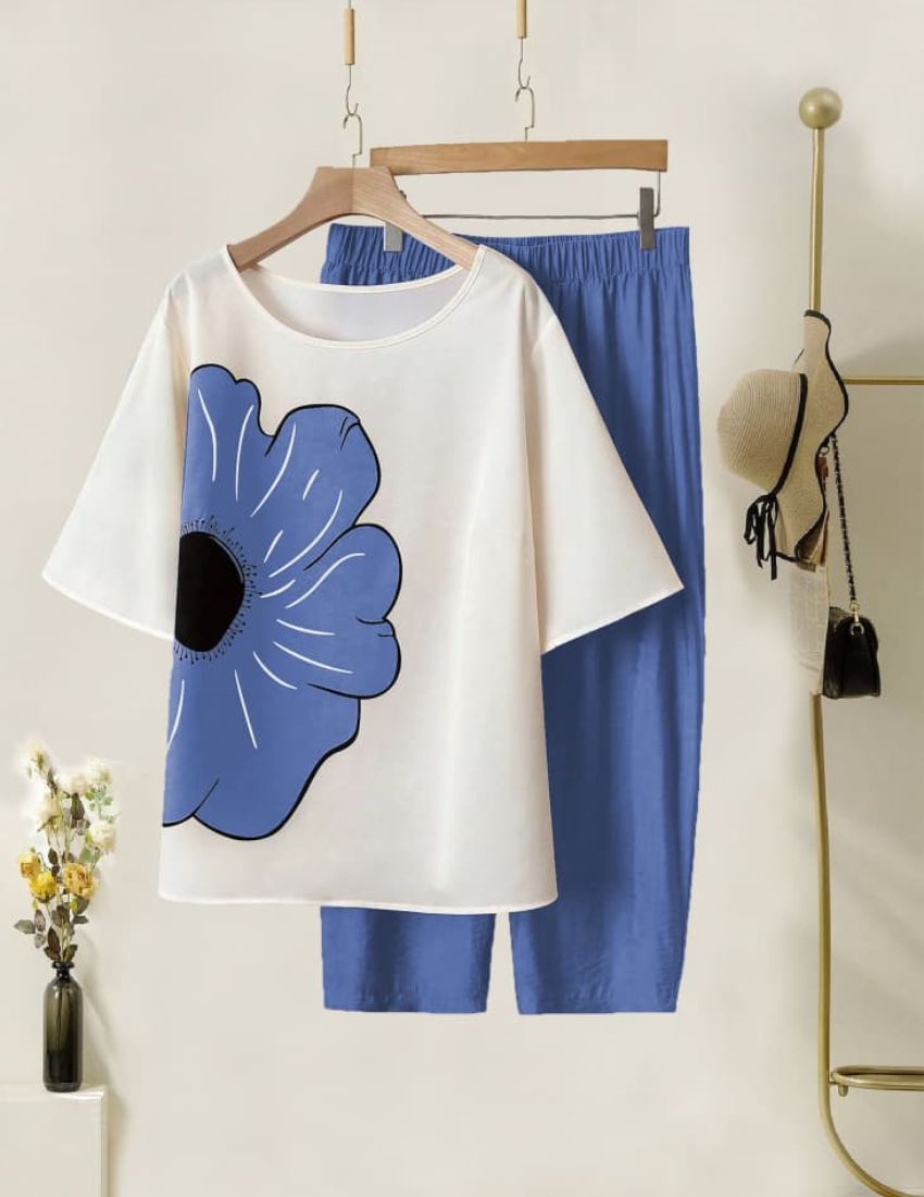 Bring freshness to your everyday style with this chic two-piece lounge set. The white oversized top features a striking blue floral graphic, perfectly paired with relaxed-fit blue bottoms. Designed in soft, breathable fabric, this set is ideal for casual wear, lounging, or travel, offering both comfort and bold style.