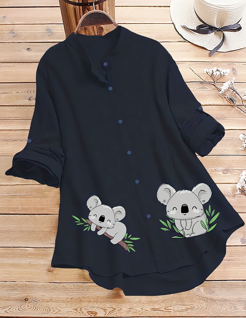 This stylish and comfortable button-up shirt. adding a playful and charming touch. With a relaxed fit, rolled-up sleeves, and a mandarin collar, this shirt is perfect for casual outings or lounging in style. making it a great choice for any season. Pair it with jeans or leggings for a cute and cozy look!