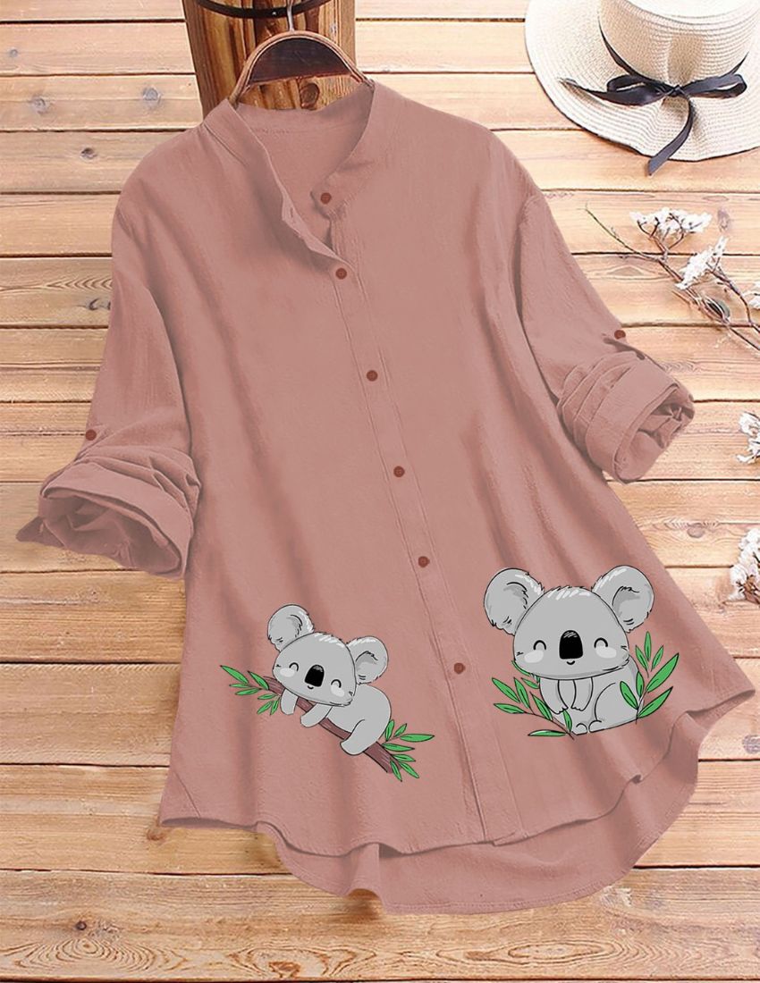 This stylish and comfortable button-up shirt. adding a playful and charming touch. With a relaxed fit, rolled-up sleeves, and a mandarin collar, this shirt is perfect for casual outings or lounging in style. making it a great choice for any season. Pair it with jeans or leggings for a cute and cozy look!