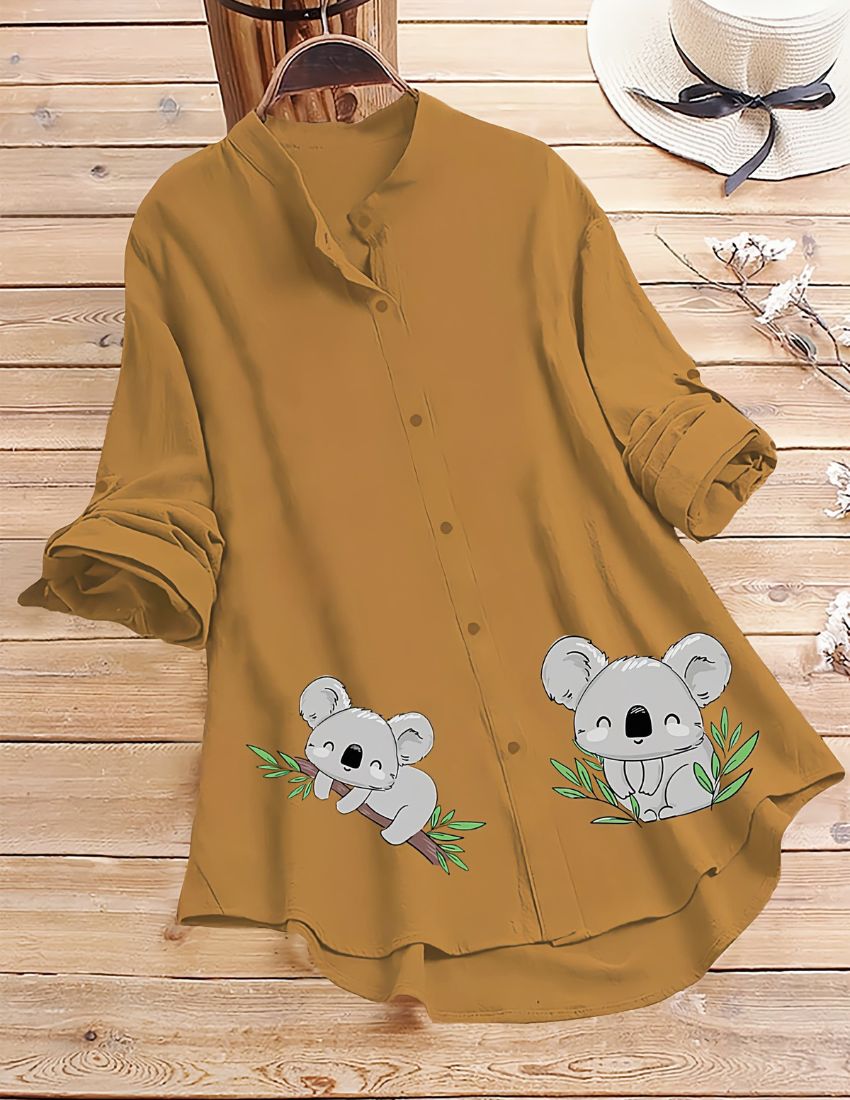 This stylish and comfortable button-up shirt. adding a playful and charming touch. With a relaxed fit, rolled-up sleeves, and a mandarin collar, this shirt is perfect for casual outings or lounging in style. making it a great choice for any season. Pair it with jeans or leggings for a cute and cozy look!